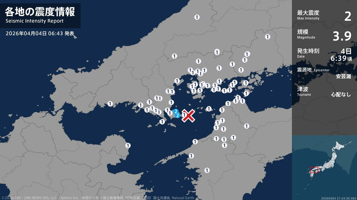 山口県で最大震度2の地震 マグニチュードは3.9と推定 津波の心配なし 広島県、愛媛県でも揺れを観測 -