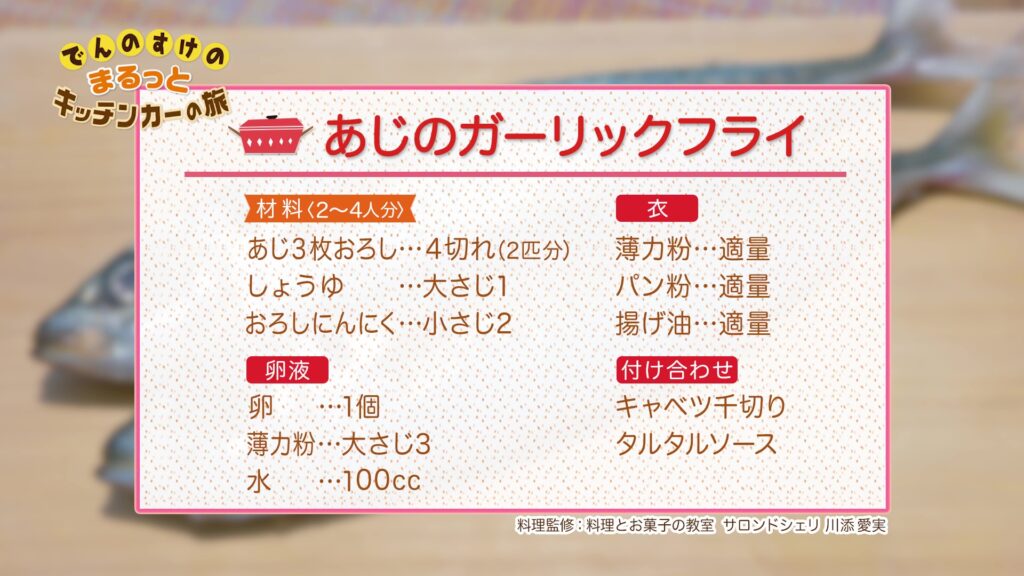 あじのガーリックフライ 2025年8月23日 材料 作り方 醤油・おろしにんにくを混ぜ、あじ全体にかける 10分ほど置きキッチンペーパーで水分を取る ボウルに卵・薄力粉・水を入れよく混ぜ卵液を作る あじに薄力粉を全体に薄くつける 卵液にくぐらせる パン粉をつけ軽く押さえる 揚げ鍋に油を入れ180℃に温める あじを入れ美味しそうな色が付くまで揚げる 器に盛り付け千切りキャベツ・タルタルソースを添える