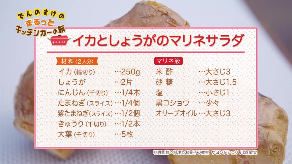 イカとしょうがのマリネサラダ 2024年11月16日 材料 作り方 生姜を細い千切りにする 鍋にたっぷりのお湯を沸かす イカを入れ火を止め、蓋をし3分予熱で火を入れる イカを取り出し、粗熱を取る 大きめのボウルにマリネ液の材料を入れ、泡だて器で混ぜる 生姜・イカ・その他材料を全て加え和え、冷蔵庫で1時間程休ませる 【ポイント】・イカは予熱で火を入れると柔らかい食感になります・生姜の香りが爽やかで美味しいです・冷蔵庫で休ませると野菜の旨味や水分が出て味がまとまります