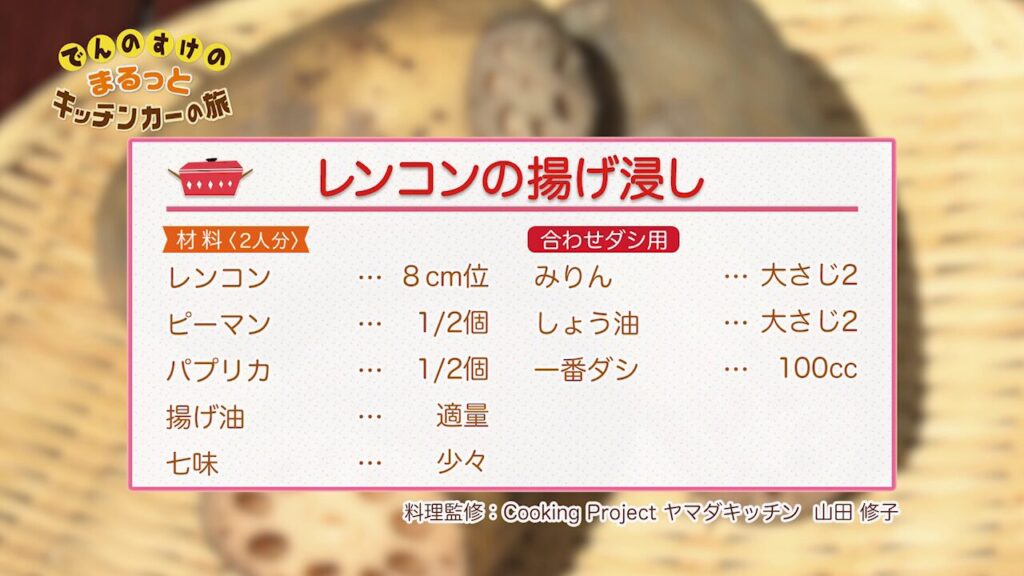 レンコンの揚げ浸し 2025年10月4日 材料 作り方 蓮根は皮をむき、1㎝くらいの輪切りにする。大きい場合は半月に切る。酢水につけてアクをぬく。 みりん・しょうゆ・一番ダシをバットに合わせておく。 蓮根の水気をとり、180℃の揚げ油で揚げる。 熱いうちに②に漬ける。 1㎝幅くらいに切ったピーマン・パプリカも同様に揚げ、熱いうちに漬ける。 器に盛り、だしも適量注ぎ、七味をふる。