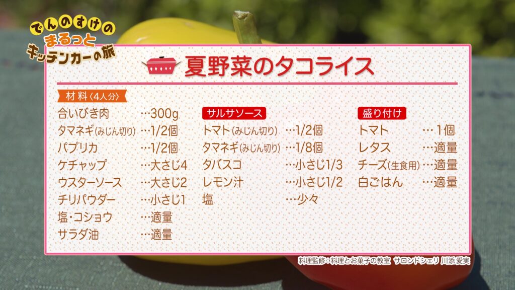 夏野菜のタコライス 2024年9月21日 材料 作り方 パプリカを1cm角に切る サルサソースの材料をボールに入れ混ぜる フライパンにサラダ油を熱し中火で玉ねぎ・パプリカを炒める いい香りがしたら合いびき肉を入れて強火で火を通す ケチャップ・ウスターソース・チリパウダーを入れて水分を飛ばすように炒める 塩・こしょうで味を整える 器に白ご飯・レタス・ひき肉・チーズ・トマト・サルサソースの順に盛り付ける ★ポイント・パプリカを炒めると甘さが出て、ソースと相性がよくなります・サルサソースはお好みで辛さを調整して下さい