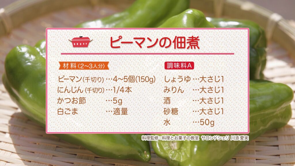 ピーマンの佃煮 2025年3月29日 材料 作り方 ピーマンは縦半分に切り種を取り、繊維に沿って千切りする 鍋にピーマン・人参・調味料Aを入れ中火にかける 沸騰したら弱火にし、汁気がなくなるまでたまに混ぜながら煮る 火を止め鰹節・白ごまは手ですり潰しながら入れる <ポイント>・ピーマン・人参は繊維に沿って切ると食感が美味しくなります・煮込む途中は焦げないように時々混ぜて下さい・白ごまは手ですり潰しながら入れると香りがよくなります