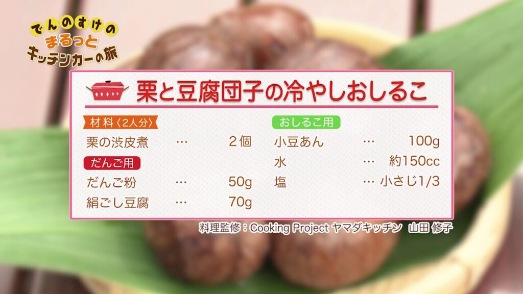 栗と豆腐団子の冷やしおしるこ 2025年5月3日 材料 作り方 だんご粉と絹ごし豆腐とを混ぜ、耳たぶくらいの固さにこねる。棒状に伸ばし、包丁で12個等分に切り、丸める。 ①を茹で、浮き上がってきたら冷水にとり、水気をきる。 鍋に小豆あん、水、塩を入れて、かき混ぜながら1分程煮る。 白玉豆腐団子・栗の渋皮煮も加える。 冷蔵庫などで冷やし、食べる直前に混ぜて器に盛り付ける。