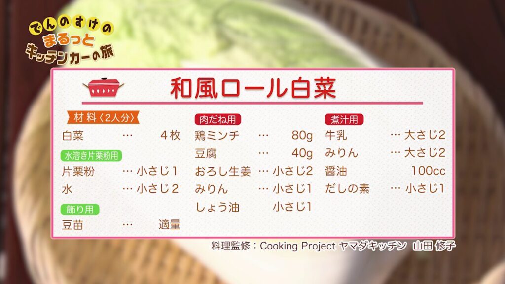 和風ロール白菜 2026年2月7日 材料 作り方 <作り方> 白菜は茹で、芯を薄くそぎ取り巻きやすくする。 削いだ芯はみじん切りにし、[肉だね用]材料と合わせ、4つに分け、白菜1枚1枚で包む。 [煮汁用]材料で煮る。(沸騰したらとろ火で10分、火加減調節自由自在) 煮えたら、ロール白菜を皿に取り出し、煮汁にとろみをつけかける。 豆苗を飾る。