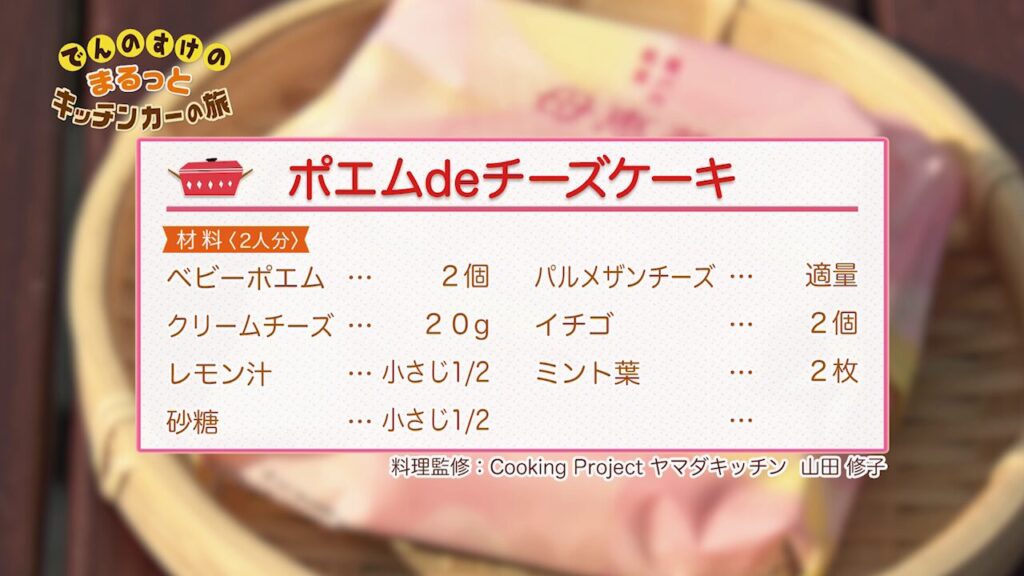 ポエムdeチーズケーキ 2026年3月14日 材料 作り方 <作り方> クリームチーズにレモン汁・砂糖を加え混ぜる。 ポエムの上面に①のクリームチーズをのせる。 その上にパルメザンチーズをふる。 グリル220℃で10分程焼き、温める 苺・ミント葉を添える。 【ポイント】 ・焼く時に、少しパルメザンチーズに焦げ目がつくと美味しそうに見えます。グリル機種・高さなどにより調整してください。