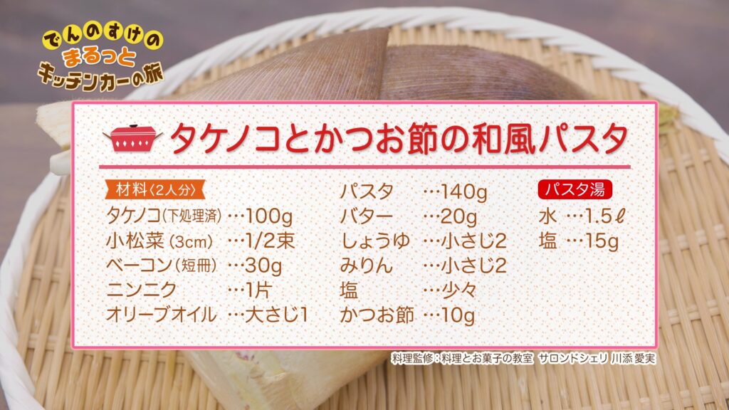 タケノコとかつお節の和風パスタ 2024年5月25日 材料(2人分) 作り方 筍を食べやすい大きさに切る。 フライパンにオリーブオイル・にんにくを入れる。中火にかけにんにくの香りがしっかりするまで加熱する。 バター・ベーコン・筍を入れ炒め、軽く塩をふる。 パスタ湯を沸かしパスタを規定時間より1分短く茹で、パスタが茹で上がる直前に③を温め弱火する。 湯切りしたパスタ・パスタ湯(40cc程度)・醤油・みりんを③に入れ、少し混ぜ火を消し、小松菜を入れ予熱で火を通す。 器にもりつけ、かつお節をたっぷりのせる。