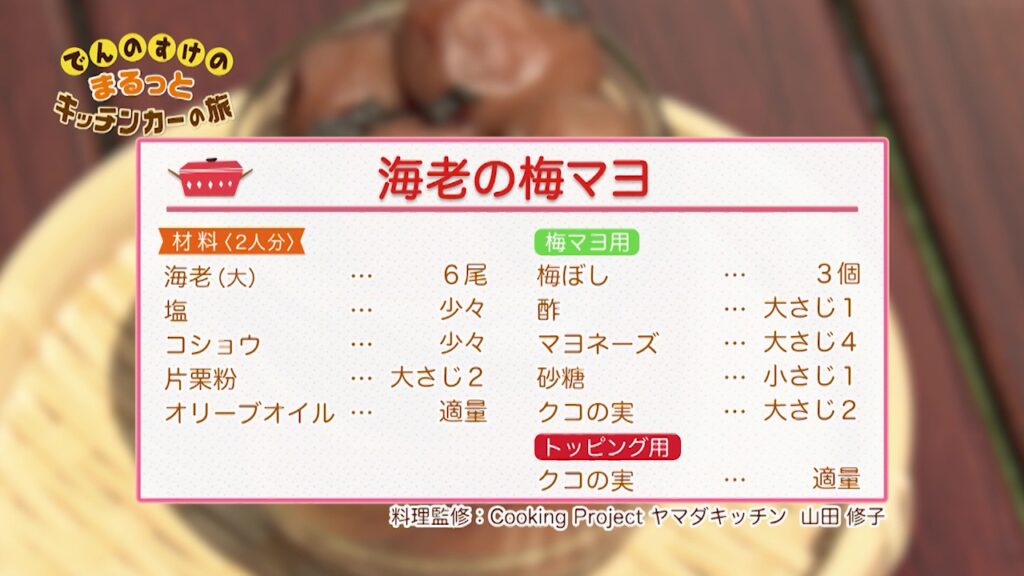 海老の梅マヨ 2024年6月1日 材料(2人分) 作り方 梅干しを刻み潰し、酢・マヨネーズ・砂糖・クコの実と合わせておく。 海老は殻と背ワタを取り除きし、塩・胡椒・片栗粉をまぶす。 オリーブオイル180℃で2分ほど揚げる。 揚げた海老を1で和え、器に盛り、クコの実を飾る。