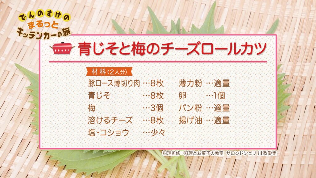 青じそと梅のチーズロールカツ 2024年10月19日 材料 作り方 (下準備)梅は種を取りペースト状にたたく。とろけるチーズは半分に切る。 青じそは軸を取り縦半分に切る。 豚肉を広げ軽く塩こしょうをする。青じそをのせ梅を手前に広げ、とろけるチーズをのせる 手前から巻き握ってしっかりくっつける。 ④に薄力粉、卵、パン粉の順に衣をつけ、170℃の油できつね色になるまで揚げる。<ポイント>巻くときはきつめに巻くと衣が綺麗につきます。薄切り肉はすぐ火が通るので、衣に色が付いたら出来上がりです。