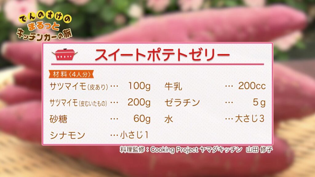 スイートポテトゼリー 2024年11月2日 材料 作り方 さつま芋はアルミホイルでくるみ、輻射熱も利用しオーブンで中までゆっくり火を通す。(200gだけ皮をむく) 鍋に①のさつま芋・砂糖・シナモン・牛乳を加え、弱火で温めながら、さつま芋を潰し混ぜる。 水で戻したゼラチンを湯煎で溶かし、②を加え、湯煎にかけながら混ぜる。 器に4つに分けて流し、冷やし固める。 角切りした残りのさつま芋を適量トッピングする。