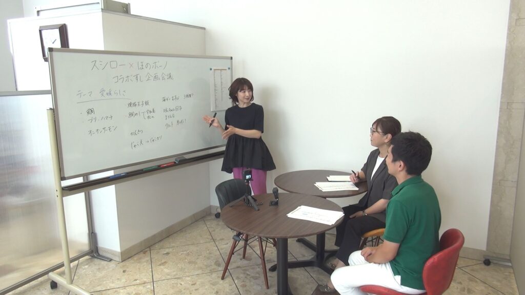 スシローコラボ企画① 2024年8月23日 人気の回転寿司チェーンのスシローから番組にオファーがあり、「愛媛らしいオリジナルのすし開発プロジェクト」が始動! キッチン内に潜入し寿司作りを見学したり、MC3人で企画会議をしたりして出てきたアイデアを店へ提案する。 そして使用する食材は愛媛らしい魚「タイ」に決定!発売に向けた取り組みに注目。 さつまいもと油揚げの甘辛煮(下のバナーからレシピ動画が視聴いただけます) 【レシピ提供】DELISH KITCHEN(デリッシュキッチン)※推奨ブラウザ:Google Chrome