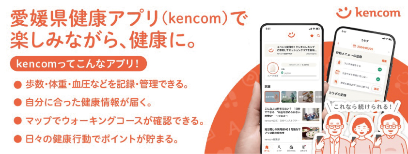 心疾患の主な原因である高血圧を予防するには、バランスの取れた食生活や適度な運動など日ごろの生活習慣の改善が重要です。 愛媛県では、塩分を控えたバランスの取れた食生活を推進するため、令和5年度に減塩推進ポータルサイトを立ち上げ、減塩レシピなど減塩生活のヒントを発信するとともに、令和6年度から、楽しく継続的にウォーキング等に取り組めるよう19歳以上の全ての県民を対象に、健康アプリkencomを運用しています。